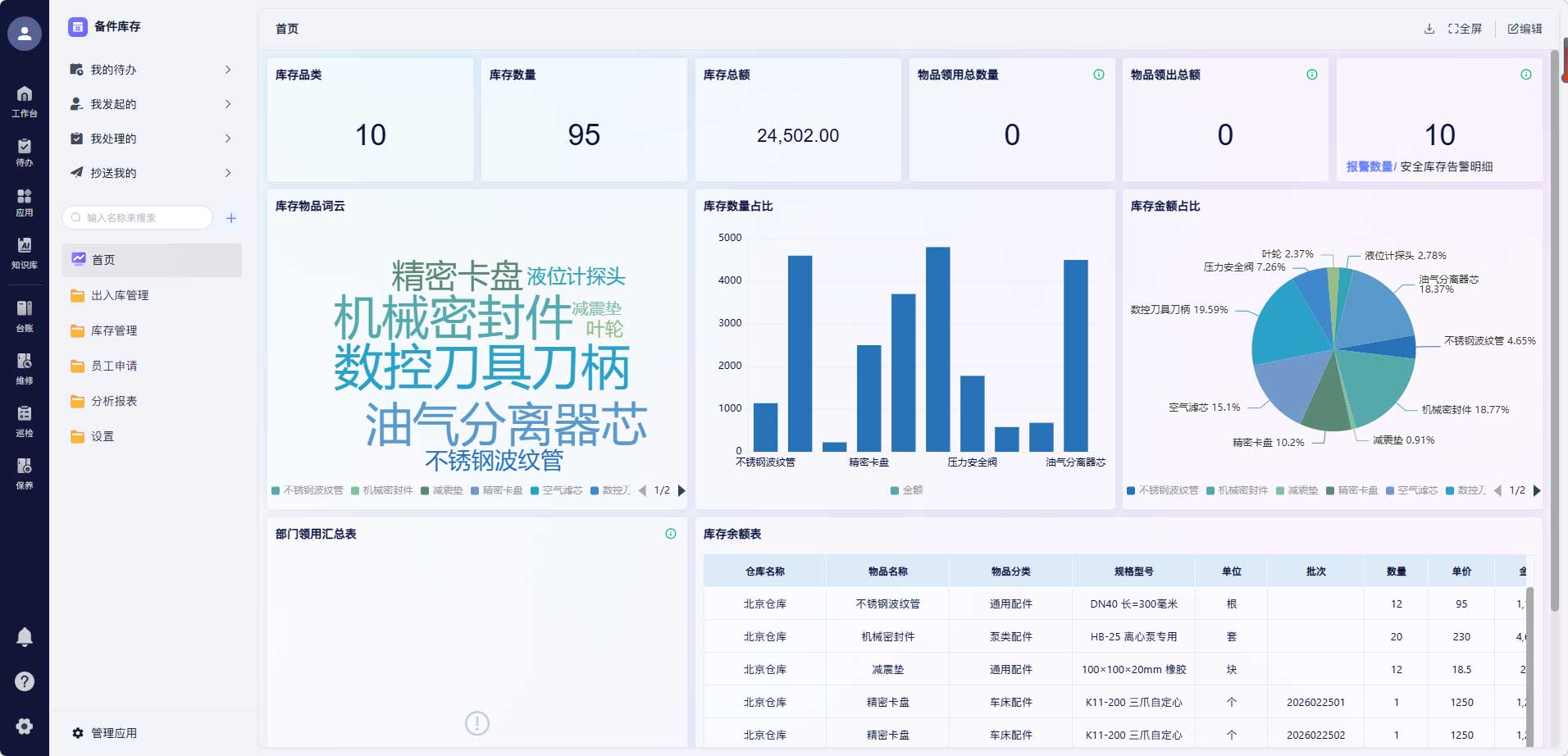 智能预警功能帮你解决“该备多少”的问题。当某个配件的库存低于安全库存线时,系统会自动提醒采购部门补货;当某个配件很长时间没被领用,系统会提示你考虑减少采购或寻找替代方案。