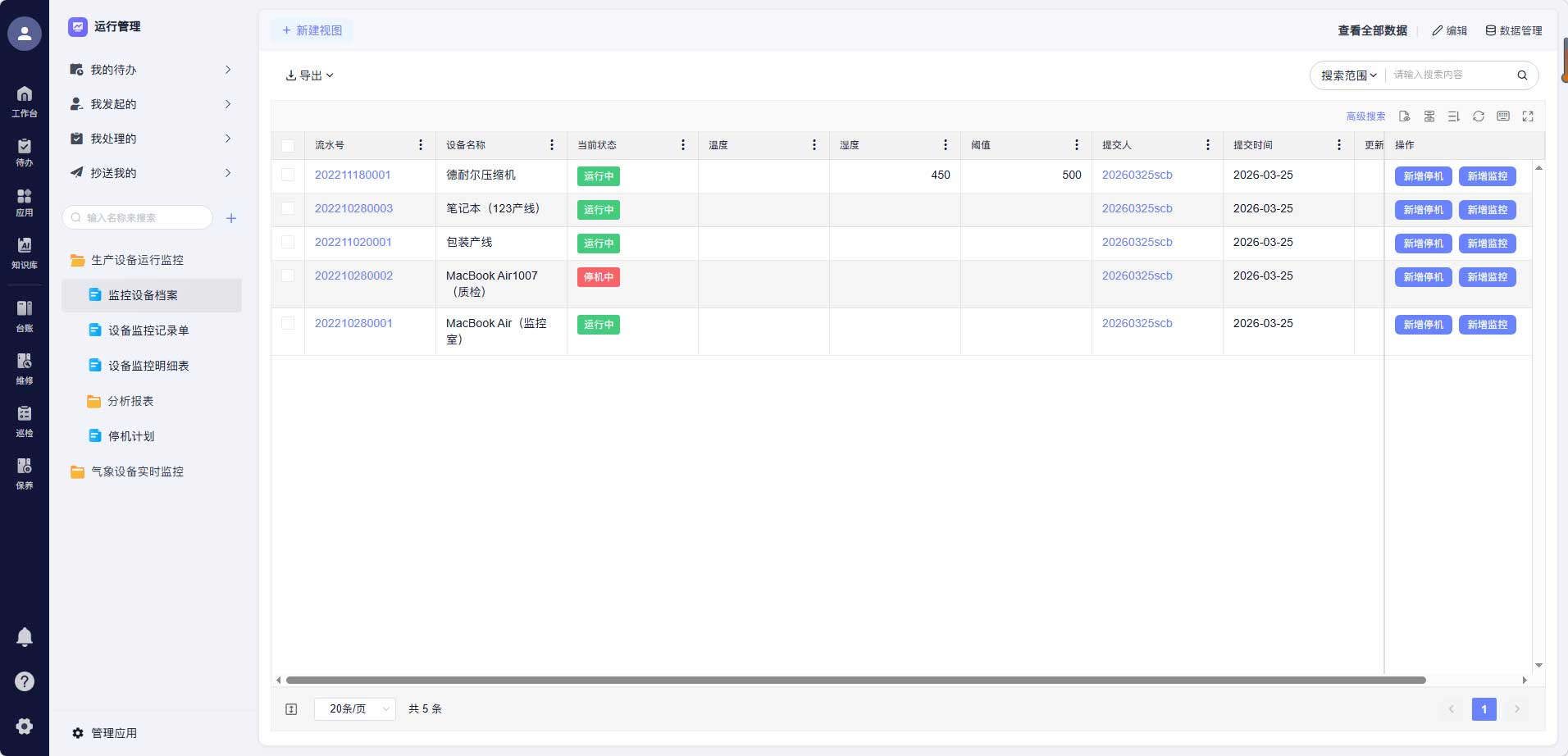 单台设备详情页展示实时运行参数曲线(如温度、振动、电流)、历史数据对比、阈值预警线,异常数据自动标红,支持放大查看细节,精准定位问题根源。