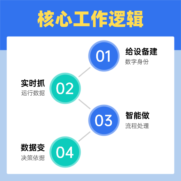 简单说,易点易动设备管理系统的核心工作逻辑就四步:给设备建“数字身份”→ 实时抓“运行数据”→ 智能做“流程处理”→ 数据变“决策依据”。全程不用复杂操作,不管是几十台设备的小厂子,还是上千台设备的大集团,都能适配。