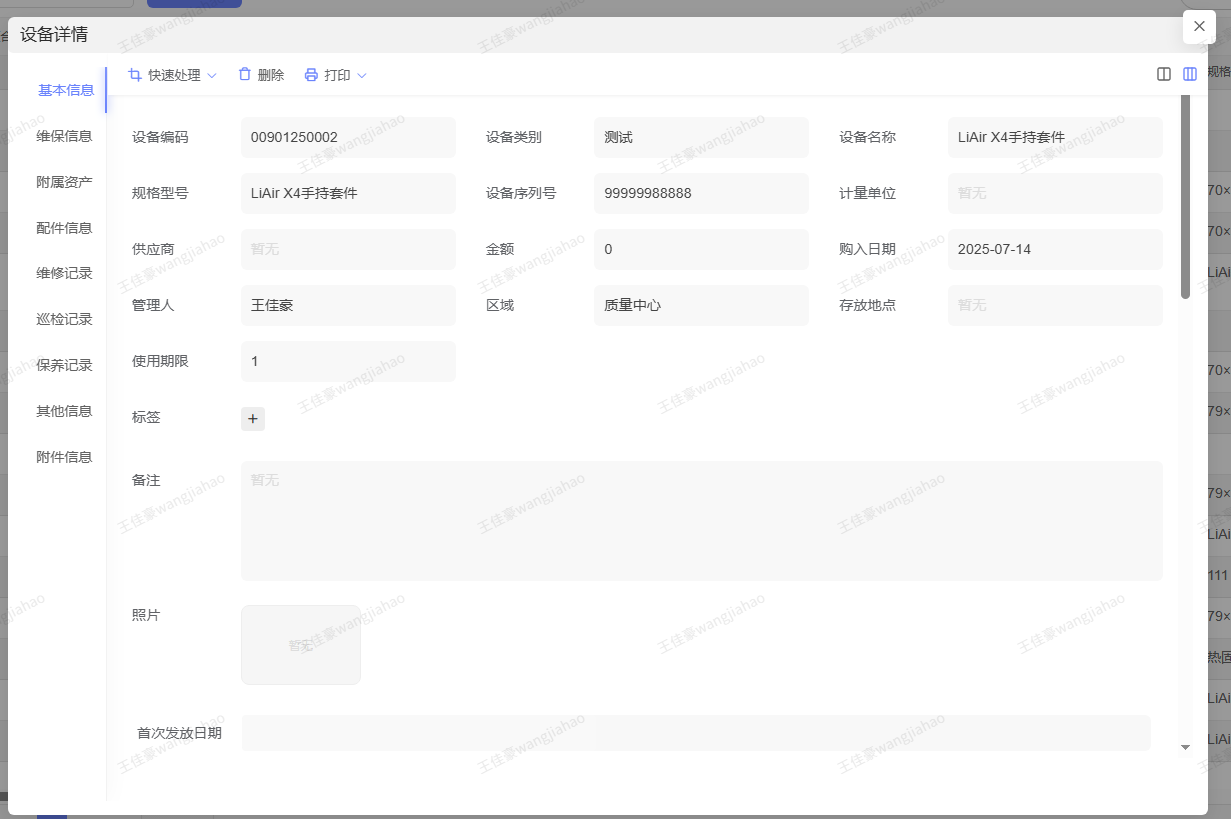 从设备采购申请开始,这张“身份证”就生效了:申购时填的型号、预算、用途,审批进度;入库时的验收信息、安装调试记录;使用中的责任人、领用调拨记录;维修时的故障情况、更换备件;直到最后报废处置的流程,所有信息都会自动归到这张“身份证”名下。不管是管理员用电脑查,还是员工用手机扫码看,10秒内就能获取设备的完整“履历”,彻底告别纸质档案和Excel的混乱。
