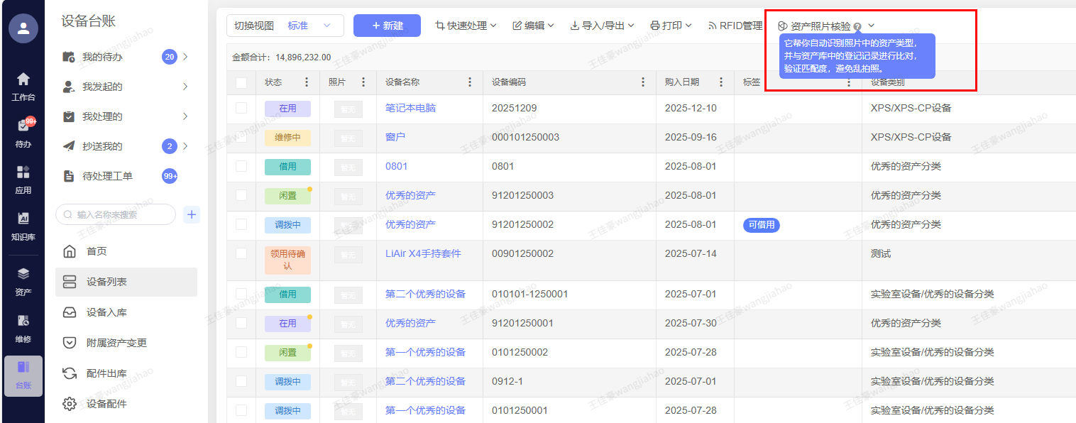 以前录设备信息,要手动填型号、序列号,又慢又容易错。这次升级加了AI图像识别功能,员工入库或检查设备时,用手机拍张设备照片,系统会自动识别型号、序列号这些信息,自动填到台账里,不用手动输入。有家互联网企业用了后,录信息的速度快了60%,错误率降到了1%以下,尤其适合电子设备、生产器械这些型号多的设备。