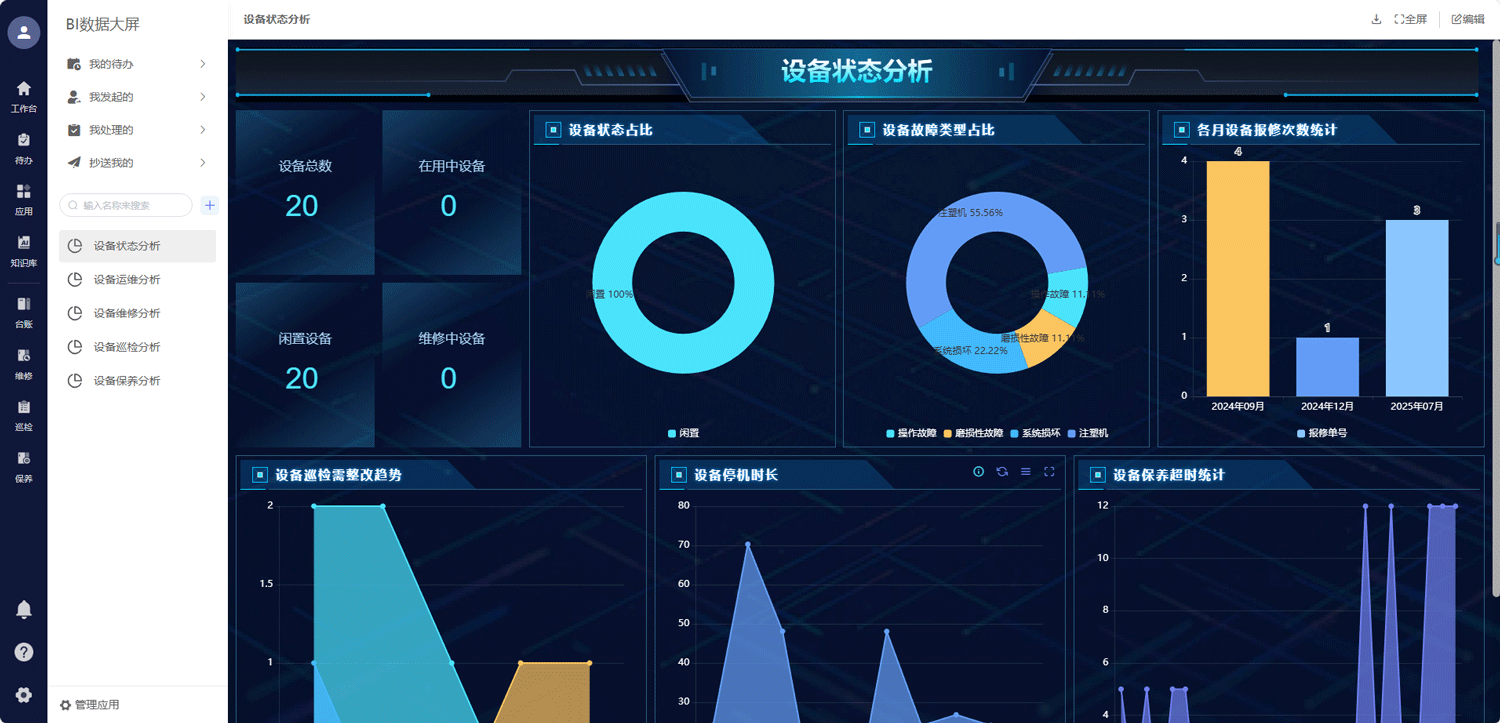 易点易动能生成很多报表,比如设备故障率、维修快慢、巡检完成情况、能耗多少这些关键数据,都能直观看到。还能自己做个性化的分析图表,10 分钟就能搞定。通过这些数据,企业能清楚知道设备好不好用、维护要花多少钱,从而决定要不要更新设备、怎么优化维护计划,不用再凭经验做事。