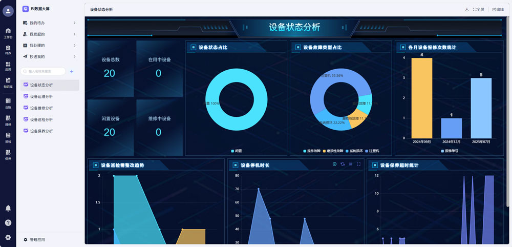 系统自动采集设备运行、巡检、维修、保养、能耗等全场景数据,通过AI算法进行多维度分析,生成设备故障率、巡检合规率、运维成本、资产利用率、能耗趋势等多种报表,直观呈现设备管理现状与优化空间。管理层无需人工统计分析,即可通过数据看板快速掌握设备运行态势,精准识别管理瓶颈,为设备采购、报废、技改、保养计划优化等决策提供科学的数据支撑,推动设备管理从“经验驱动”转向“数据驱动”。