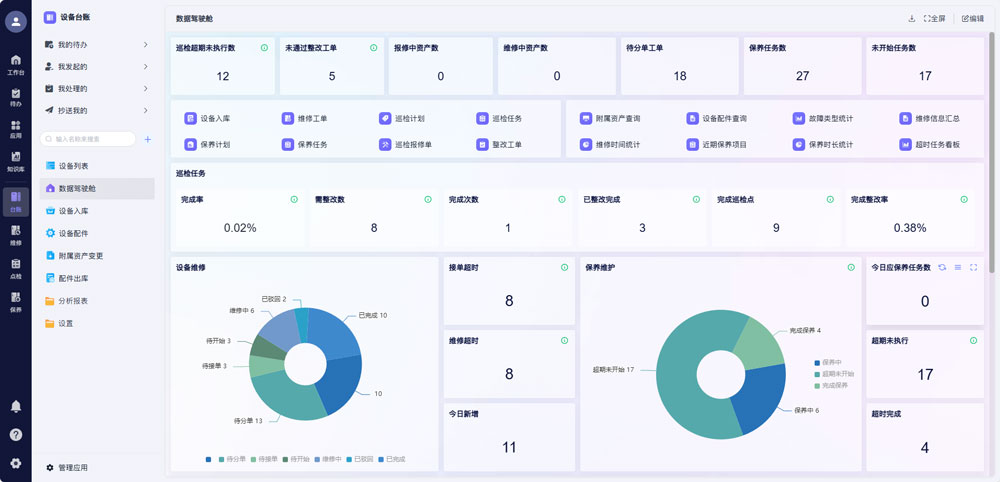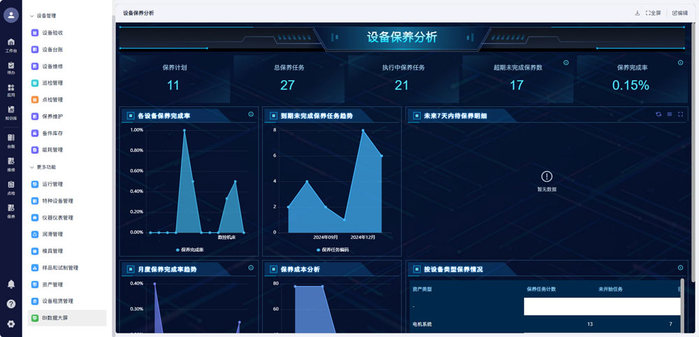 5.数据驱动:预置几十套数据分析报表,可自定义创建BI分析看板,10分钟就能生成个性化报表,设备运行数据、运维数据、备件数据一目了然,助力企业精准决策,优化运维方案,进一步降本增效,实现从“经验驱动”到“数据驱动”的转型。