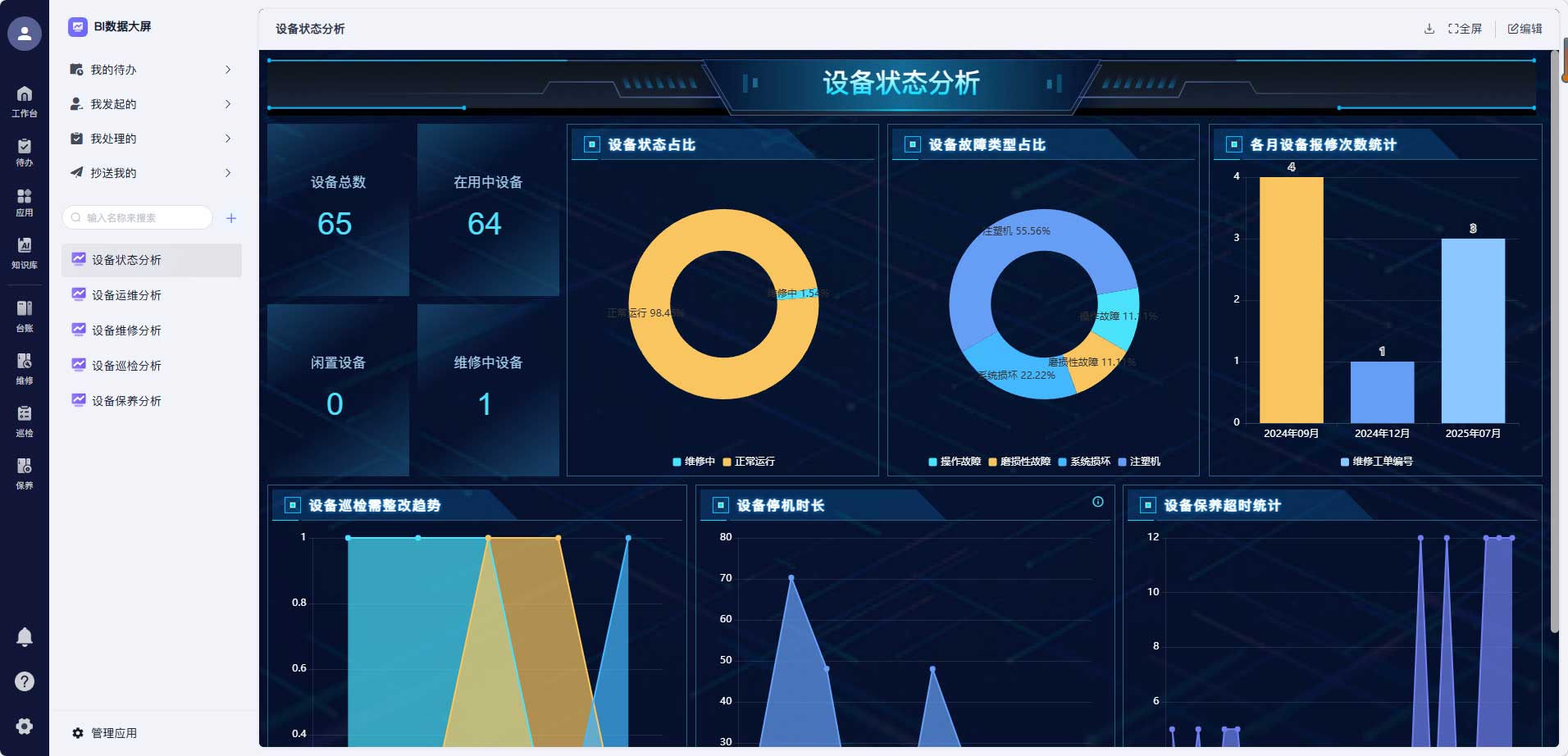 传统巡检的纸质记录,难以量化分析,无法为设备管理优化提供支撑。而易点易动的AI数据分析功能,能自动整理巡检数据,生成巡检效率、故障频次、维护成本等各类报表,直观呈现巡检效果和设备健康状态,让管理者一眼看清问题所在。