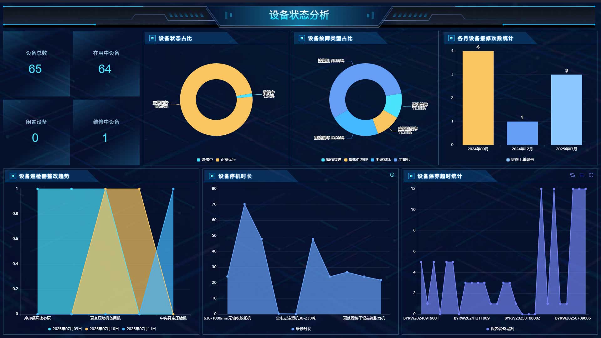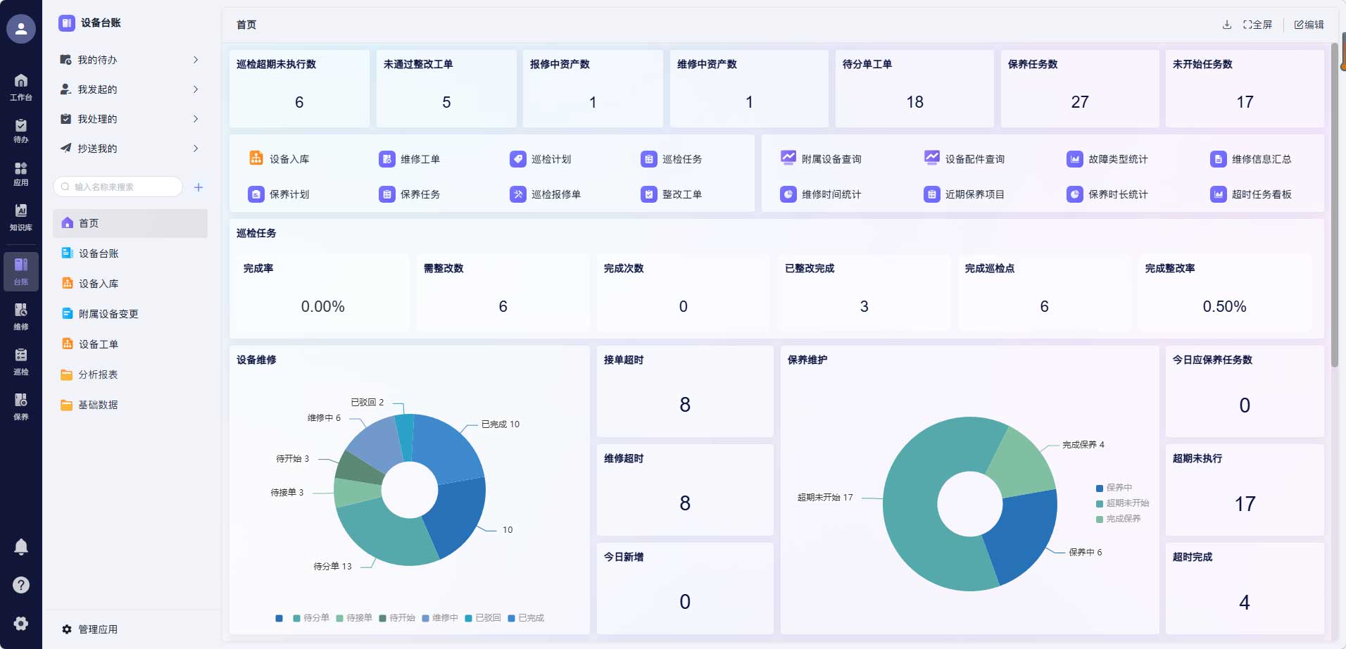 系统将设备管理的各个环节整合到一个平台:设备台账、巡检计划、维修工单、备件库存、采购审批、数据分析,全部在一个系统里流转。