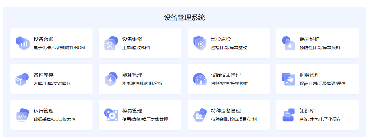 | 资产台账 | 一机一码(二维码/RFID),记录技术参数、文档。 | 实现资产“身份证”化管理。 |