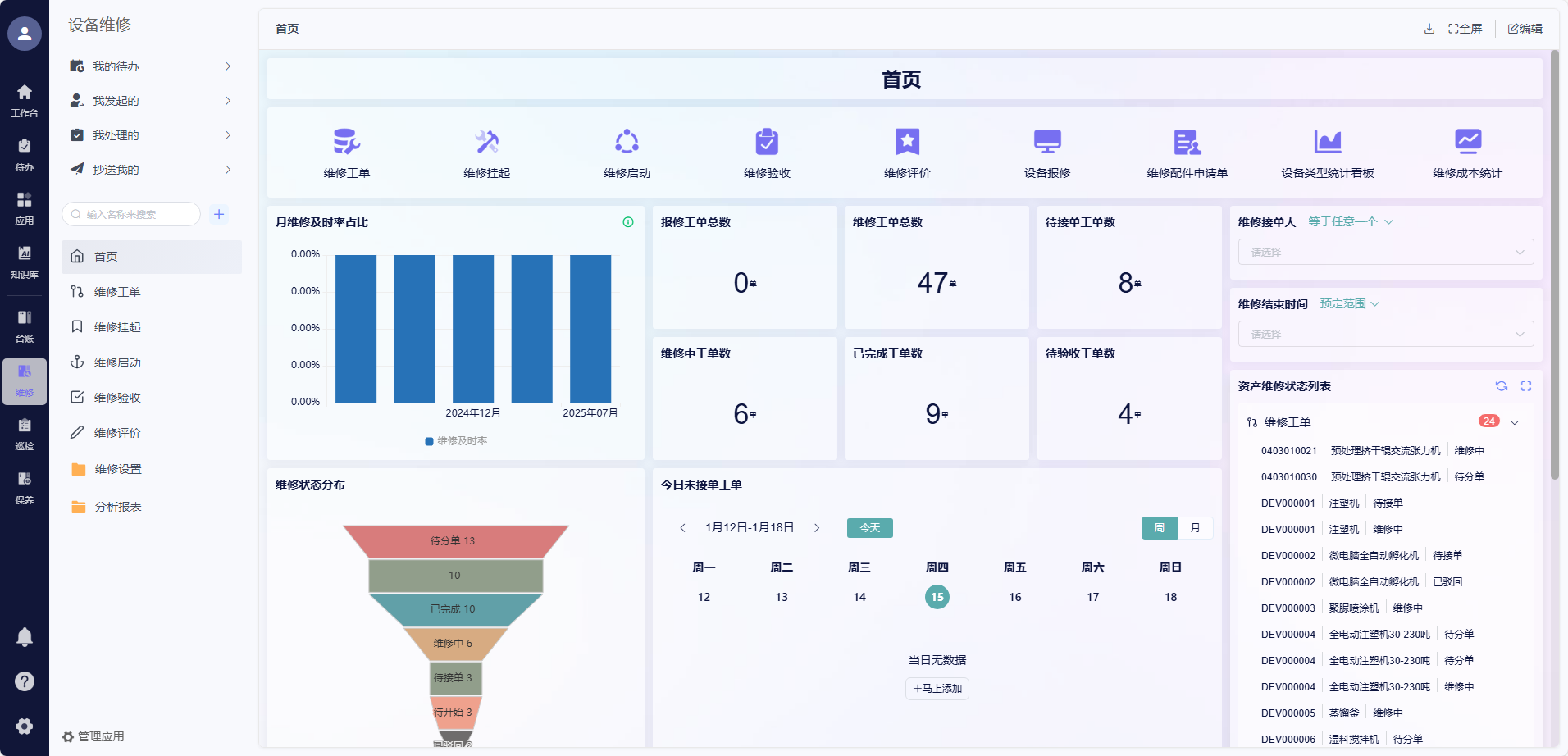 简化故障报修、维修流程,实现全流程移动化管控。员工发现设备故障后,扫码即可提交报修单,上传故障照片、描述问题;平台智能匹配对应技能的维修人员,自动派单并跟踪工单进度(接单-维修中-验收),维修过程、耗材使用、成本核算实时记录,平均缩短工单响应时间15-30分钟,维修效率显著提升。